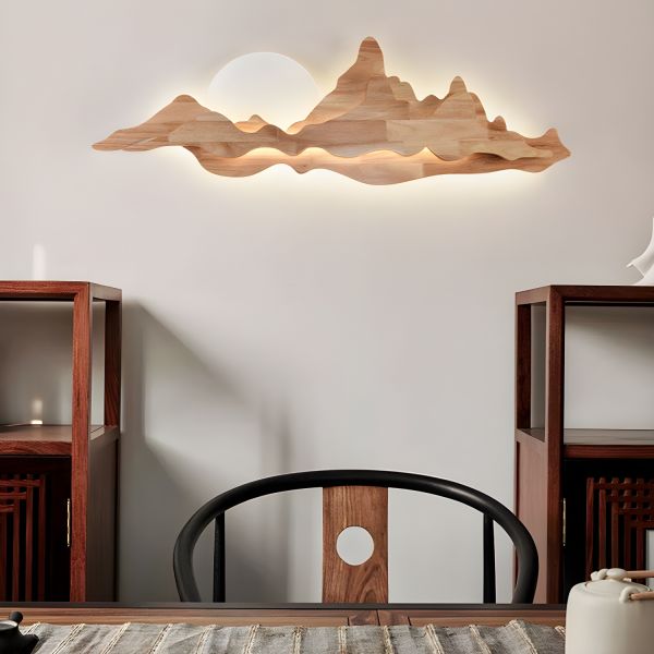Japandi Wood Mountain Wall Sconce, LED Landscape Art Fixture - 110V-120V Wood Color 31.5" Warm Light