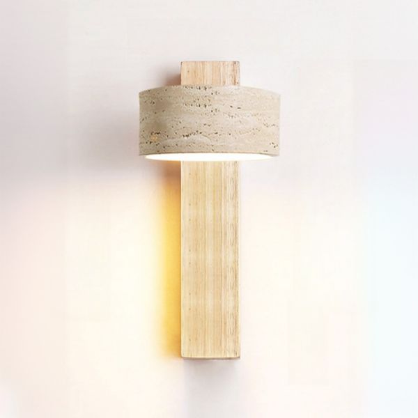 Japandi Travertine Stone Wall Sconce with Adjustable Solid Wood Base - 110V-120V Wood Color