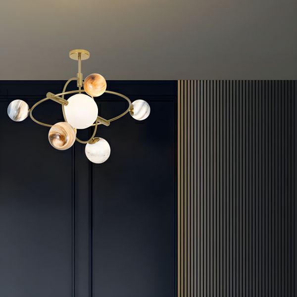Mid-Century Orbit Chandelier, Brushed Brass Pendant with Swirling Planetary Glass Globes - 7 110V-120V Downrods