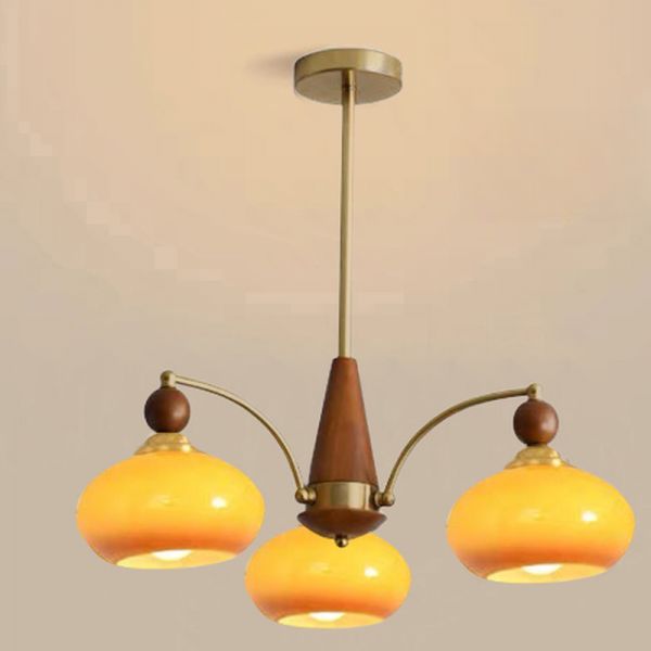 Mid-Century Walnut and Brass Chandelier, Glass Globe Ceiling Light Fixture for Dining Room - 3 Orange 110V-120V