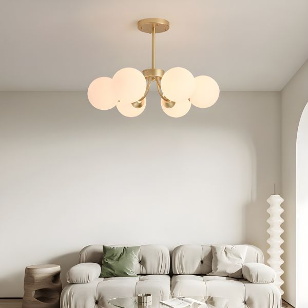 Mid-Century Gold Globe Chandelier, 6-Light Semi Flush Mount with Glass Shades - 110V-120V Milk White