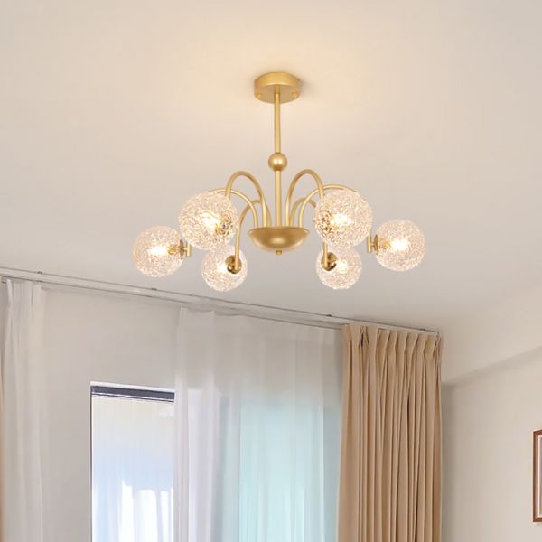 Mid-Century Gold Globe Chandelier, Semi-Flush Ceiling Light Fixture with Curved Arms for Living Room - 110V-120V 6 Water Glass