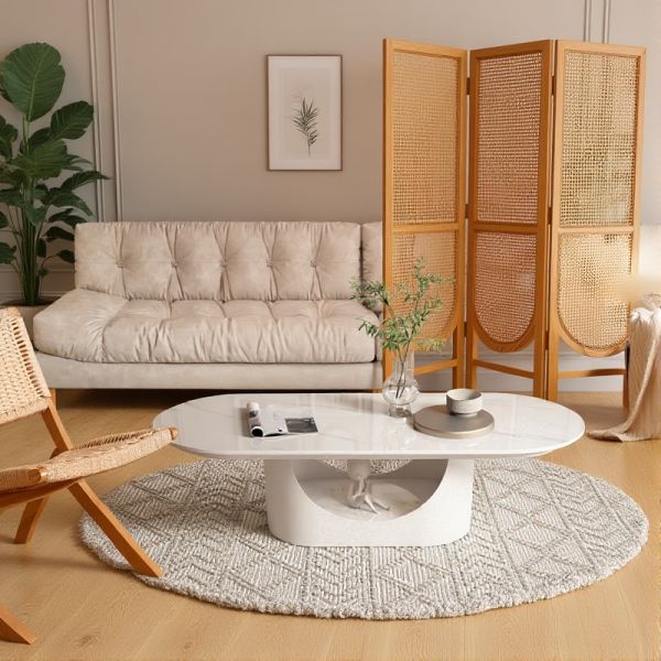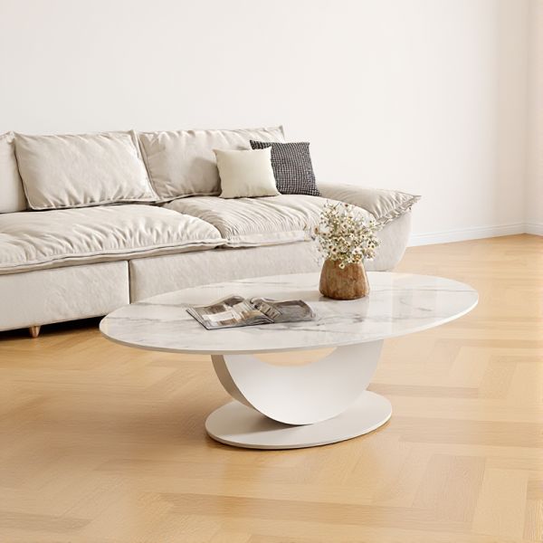 Modern Oval White Coffee Table with Faux Marble Top, Curved Sculptural Base Centerpiece for Living - White/Grey 39"L x 22"W x 18"H+20"L x 20"W x 20"H