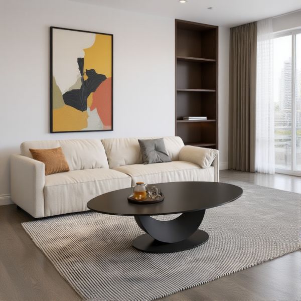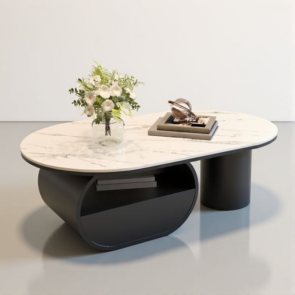 Sleek Oval Coffee Table with Faux Marble Top, Minimalist Living Room Center Table with Sturdy Base - 47"L x 24"W x 16"H Black