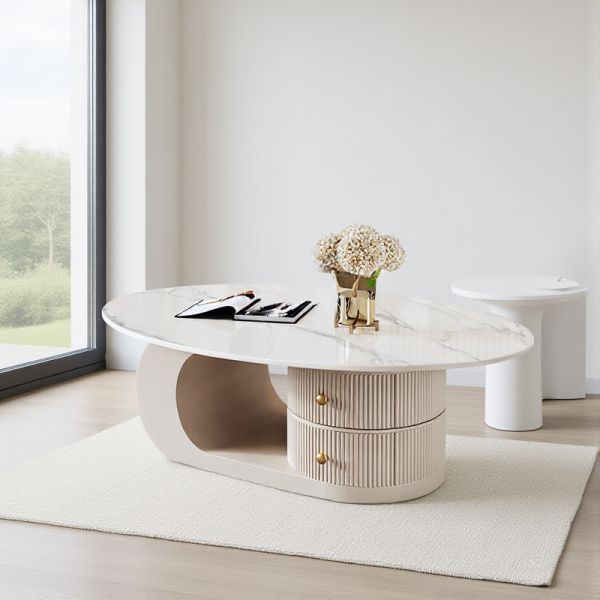 Modern Oval Faux Marble Top Coffee Table with 2 Storage Drawers, Sculptural Base Living Room Center - White 39"L x 22"W x 16"H Gloss White