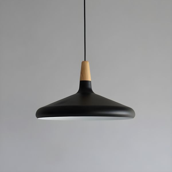 Scandinavian Pendant Light Fixture with Real Wood Accent, Matte Metal Hanging Lamp for Kitchen Island - 110V-120V Black 16"