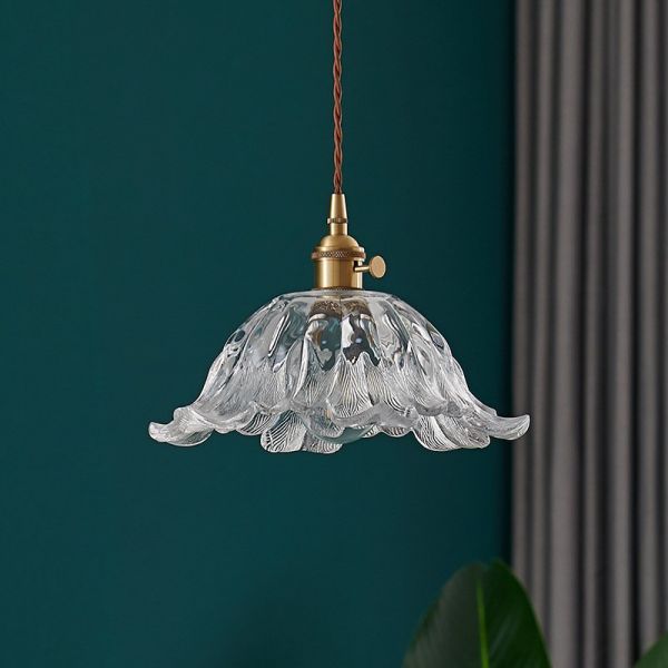 Nordic Floral Brass Pendant Light with Handmade Water Ripple Glass Shade - Clear 110V-120V