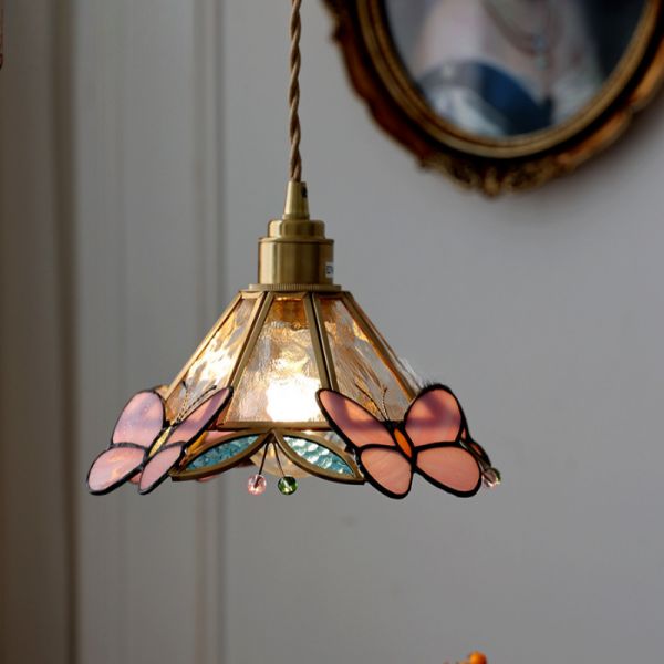 Vintage Stained Glass Butterfly Pendant Light, Artistic Hanging Lamp with Brass Finish for Kitchen - 1 Brass 110V-120V
