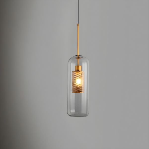 Mid-Century Industrial Glass Pendant Light, Capsule Hanging Fixture with Inner Mesh Diffuser - Brass Clear 12" 110V-120V