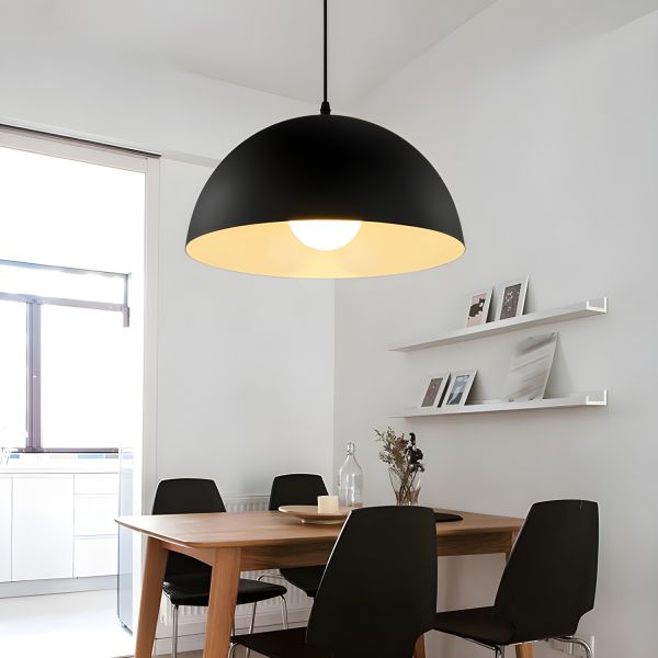 Scandinavian Dome Pendant Light, Metal Hanging Lamp with Wood Grain Accent for Kitchen Island - 110V-120V Black Small Size