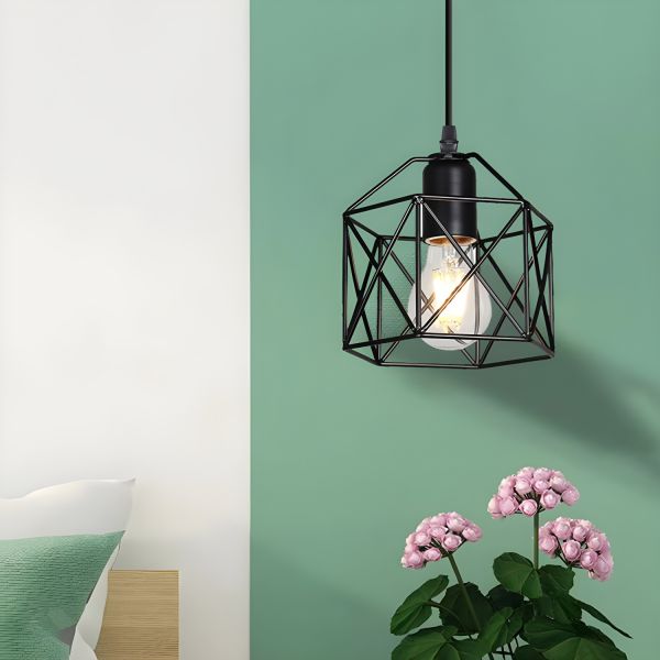 Industrial Geometric Wire Cage Pendant Light Fixture with Matte Black Metal Finish - 110V-120V Round
