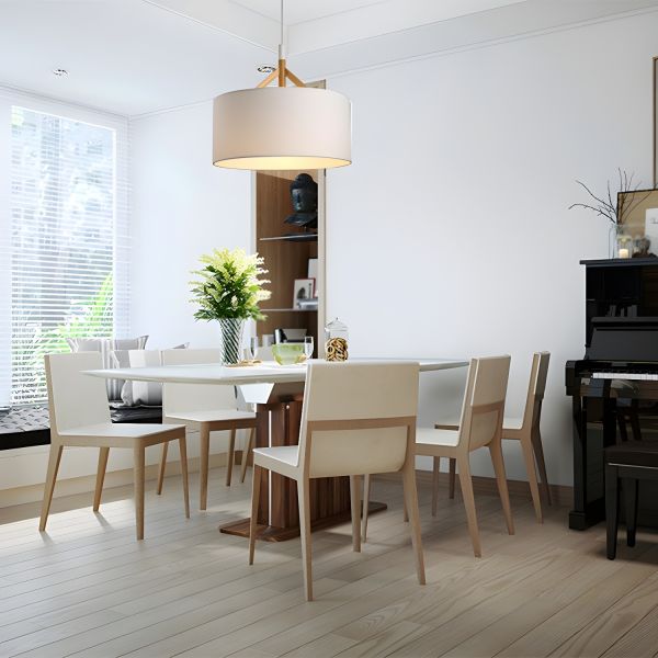 Scandinavian Fabric Pendant Light with Natural Wood Accents and Drum Shade - White 110V-120V