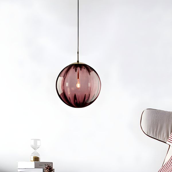 Modern Art Deco Ribbed Glass Pendant Light, Colored Sphere Fixture for Dining Room & Bedroom - Burgundy 110V-120V