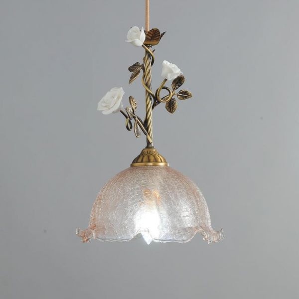 French Country Floral Pendant Light with Ceramic Roses and Scalloped Glass Shade - 110V-120V 23 cm