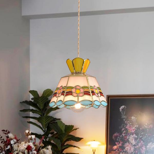 Vintage Stained Glass Mini Pendant Light, Art Nouveau Floral Hanging Lamp - 1 110V-120V Blue/Yellow