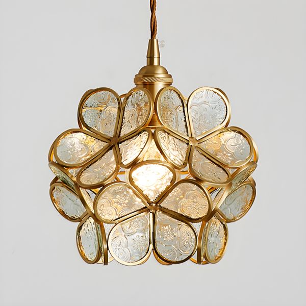 Vintage Brass Glass Flower Pendant Light, Hand-Blown Petal Hanging Lamp with Textured Shade for Kitchen Island Entryway - 110V-120V White/Clear