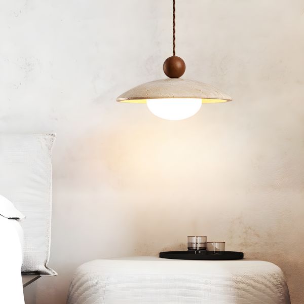 Japandi Travertine Pendant Light Natural Stone Hanging Lamp with Wood Accent