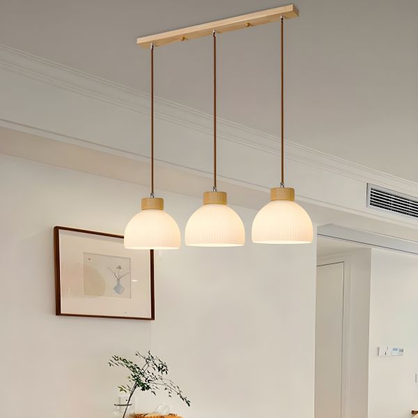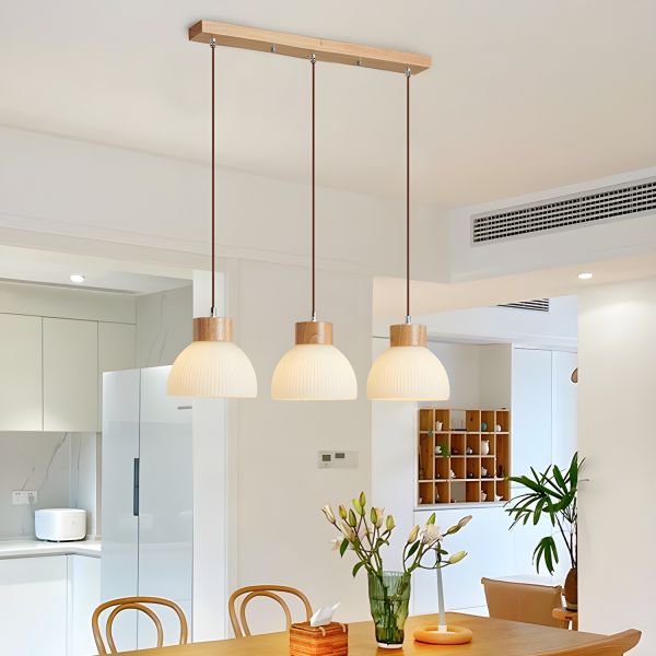Scandinavian Wood Pendant Light with Ribbed Glass Shades for Kitchen Island
