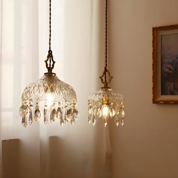 Vintage French Crystal Mini Pendant Light, Antique Brass & Diamond Glass Shade