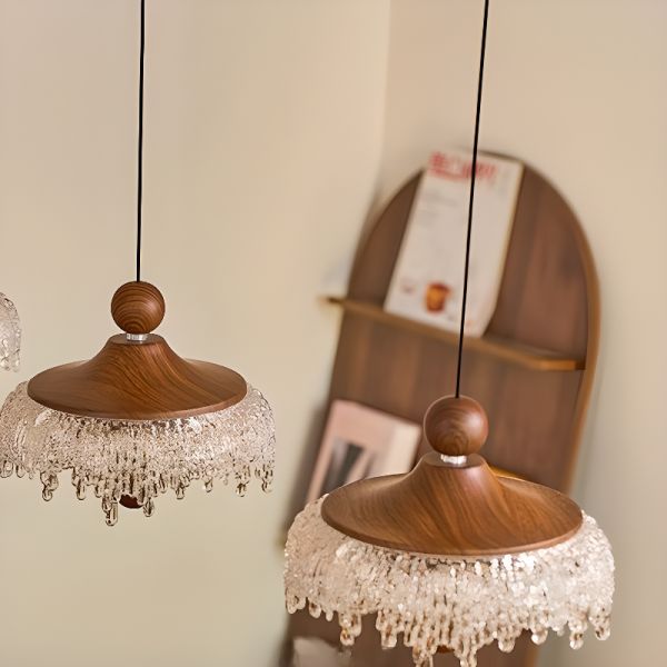 Mid-Century Walnut Finish Pendant Light with Textured Water Drop Glass Shade