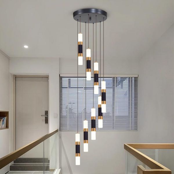 Contemporary Minimalist LED Cluster Pendant, Cascading Black & Gold Chandelier for High Ceilings