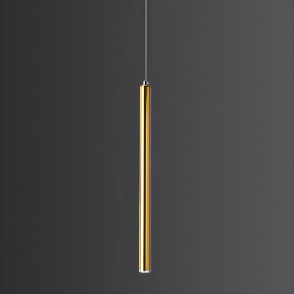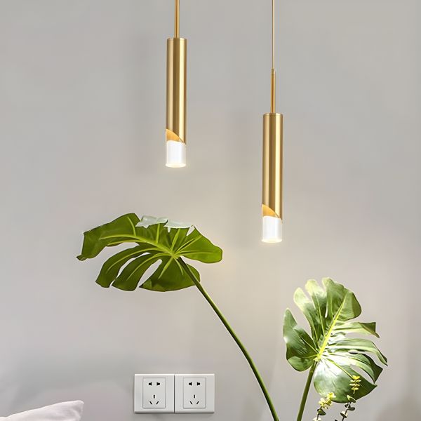 Minimalist Brushed Gold Cylinder Pendant Light, Slim LED Tube Hanging Fixture for Kitchen Island, Bar, and Bedside Accent Lighting