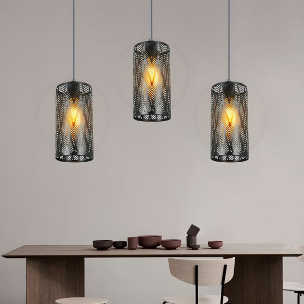 Industrial Boho Metal Pendant Light, Black Cylinder Shade with Cutout Leaf Pattern