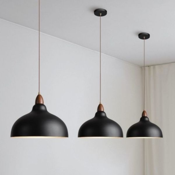 Scandinavian Metal Dome Pendant Light with Walnut Finish Detail for Kitchen Island Dining