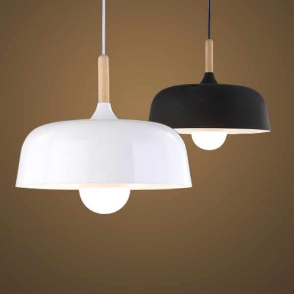 Scandinavian Metal Dome Pendant Light with Wood Accent, Minimalist Hanging Fixture for Kitchen Island