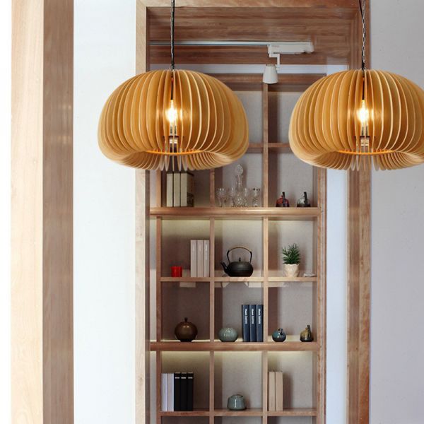 Scandinavian Wood Slat Pendant Light, Organic Pumpkin Hanging Lamp with Adjustable Cord