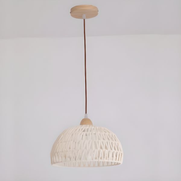 Coastal Boho Handwoven Pendant Light, White Rope Dome Ceiling Fixture with Wood Accent for Dining Room Kitchen