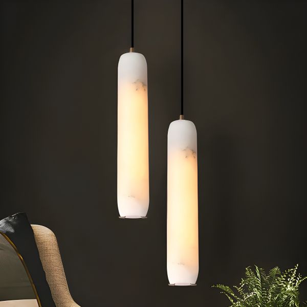 Japandi Natural White Jade Pendant Light, Brushed Brass Cylinder Hanging Lamp for Bedroom Living Room
