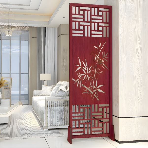 Chinese-Style Red Wood Room Divider with Bird & Bamboo Cutout, Freestanding Privacy Screen - 24"L x 75"H