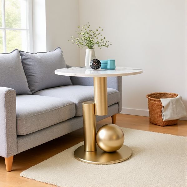 Modern Round Side Table with White Faux Marble Top & Sculptural Metal Base for Living Room - Gold White 20"L x 20"W x 22"H