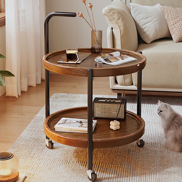 Round Wood 2-Tier Rolling Coffee Table Bar Cart with Storage Shelves, Metal Frame, Locking Casters - 23.6"L x 23.6"W x 26.8"H