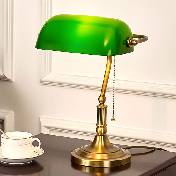 Vintage H65 Brass Banker Lamp with Hand-Blown Emerald Green Glass Shade & Pull Chain - 110V-120V