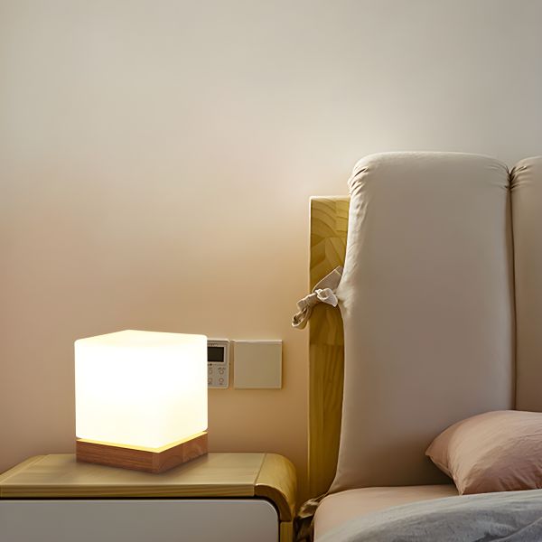 Geometric Frosted Glass Cube Lamp with Natural Wood Base for Soft Ambient Lighting - 110V-120V White
