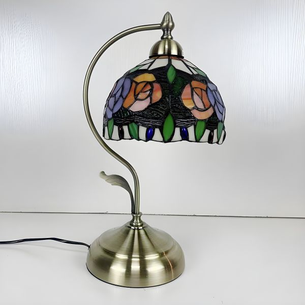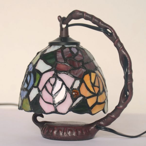 Domed Night Lamp Mediterranean Green Handcrafted Stained Glass Shade with Rose Pattern