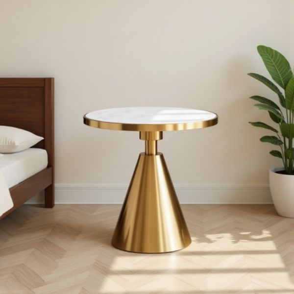 Modern Round Marble-Look Top End Table with Gold Cone Pedestal Accent Table for Living Room - Gold White 31.5"L x 31.5"W x 29.5"H