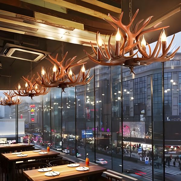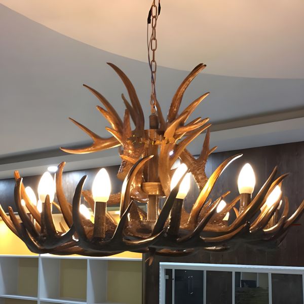 Brown Candle Designed Chandelier Countryside Resin 6 Heads Dining Room Suspension Pendant with Antler
