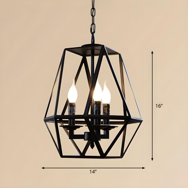 3 Heads Metal Pendant Chandelier Countryside Black Candle Designed Living Room Ceiling Suspension Lamp with Geometric Cage