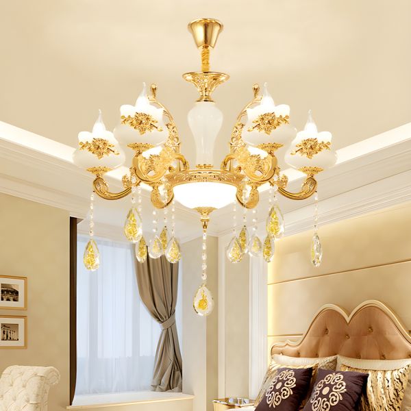 French Country Gold Crystal Chandelier Elegant Floral Glass Shade Ceiling Light for Grand Foyer - 110V-120V Gold 6