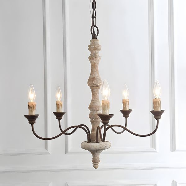 Candle Dining Room Suspended Lighting Fixture Traditional Wooden 5-Head Distressed White Chandelier - 110V-120V Distressed White