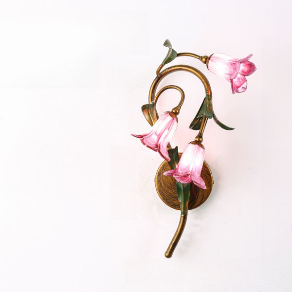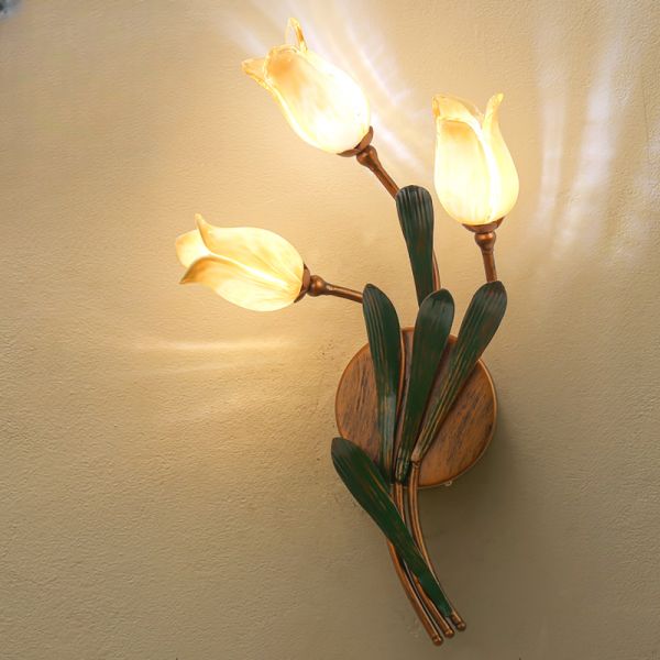 Red Brown Floral Sconce Lamp Countryside Amber Glass 3 Heads Bedroom Wall Light Fixture