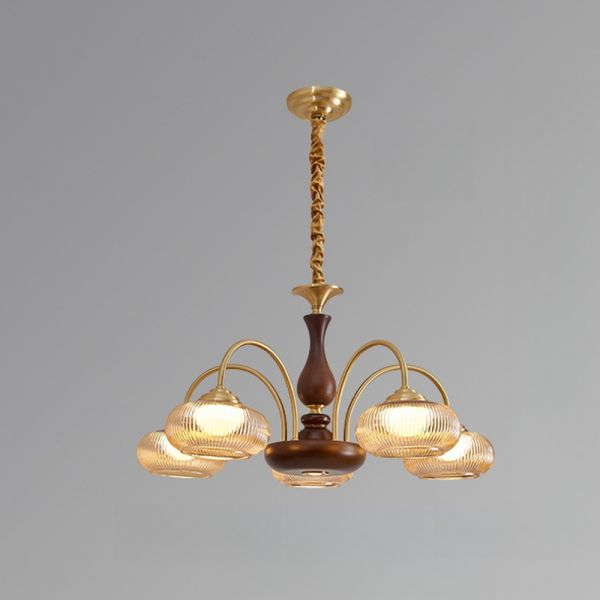 Scandinavian Solid Wood & Brass Chandelier with Ribbed Glass Shades - 110V-120V Walnut 3